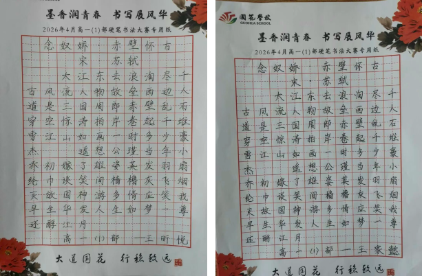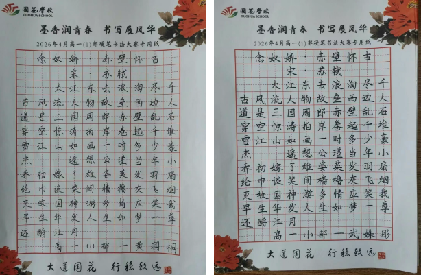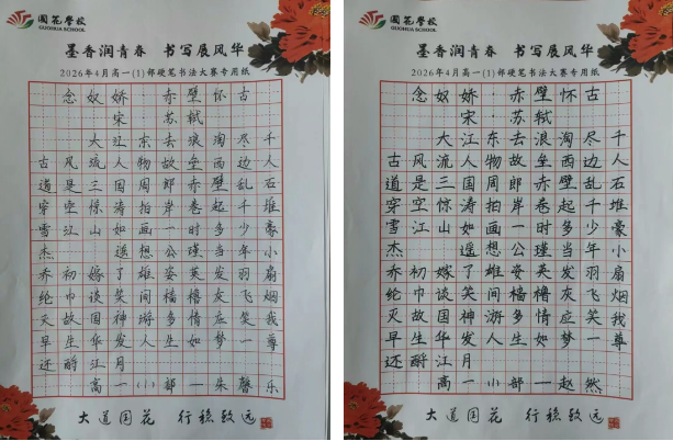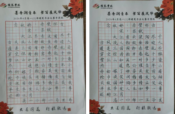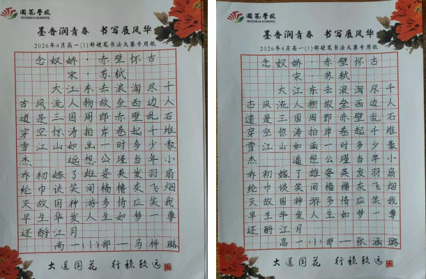 为弘扬中华优秀传统文化,丰富校园文化生活,充分展现国花学子深厚的艺术素养与昂扬的青春风采,近日,我校高一年级举办以“墨香润青春·书写展风华”为主题的书法比赛。